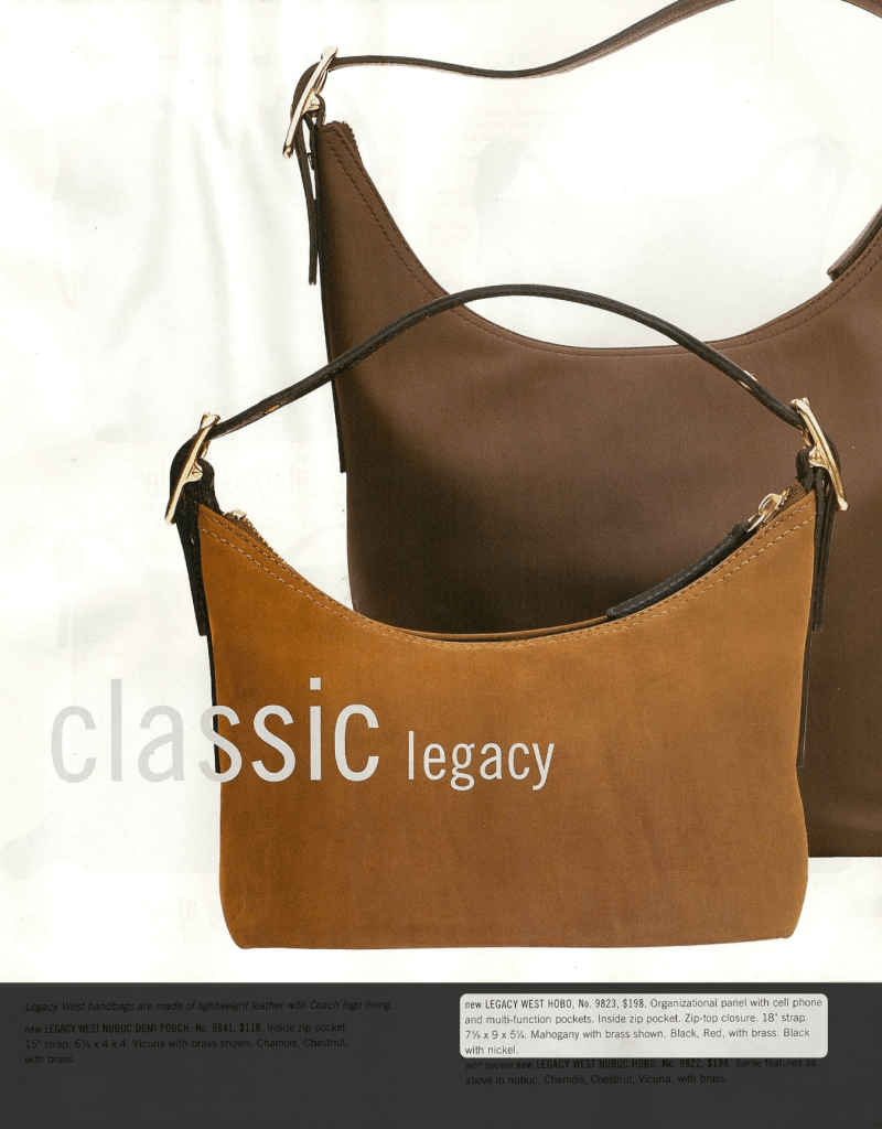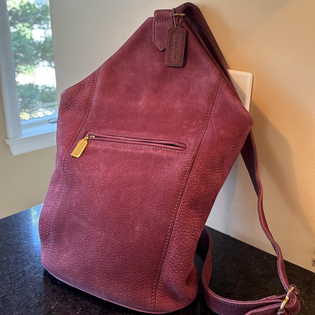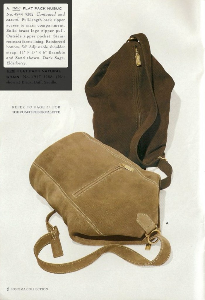 This one (Style No. 4944 in Elderberry) is probably my most prized Coach item. It was part of the Sonoma collection, described as follows in the Autumn ’95 catalog: